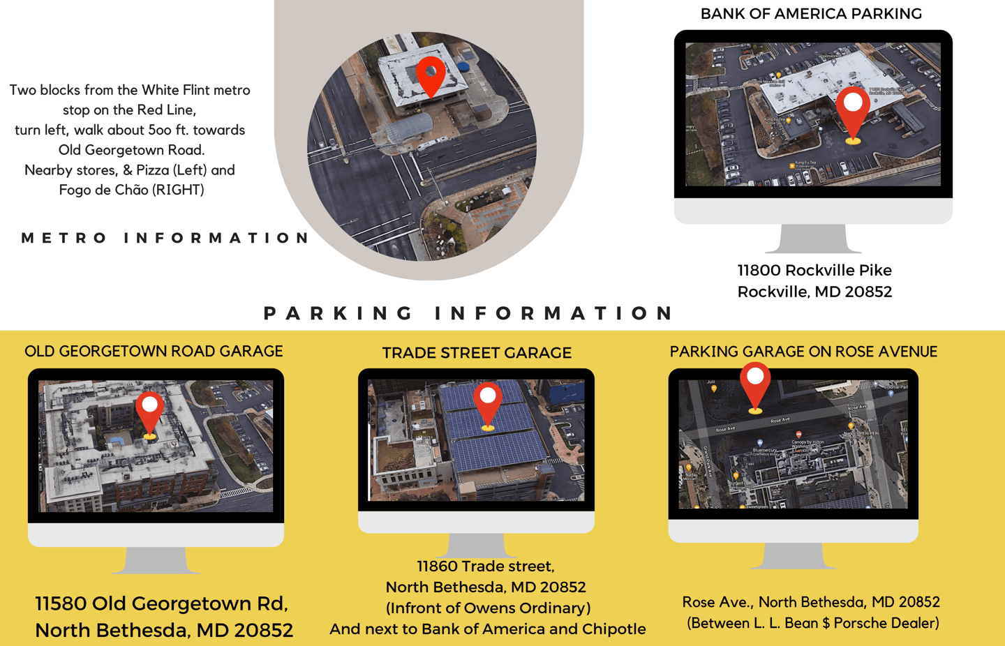 Two Blocks from North Bethesda Metro station on Red Line, turn left, walk about 500 ft. towards Old Georgetown Road. Nearby store, & Pizza (left) and Fogo de Chao (Right)